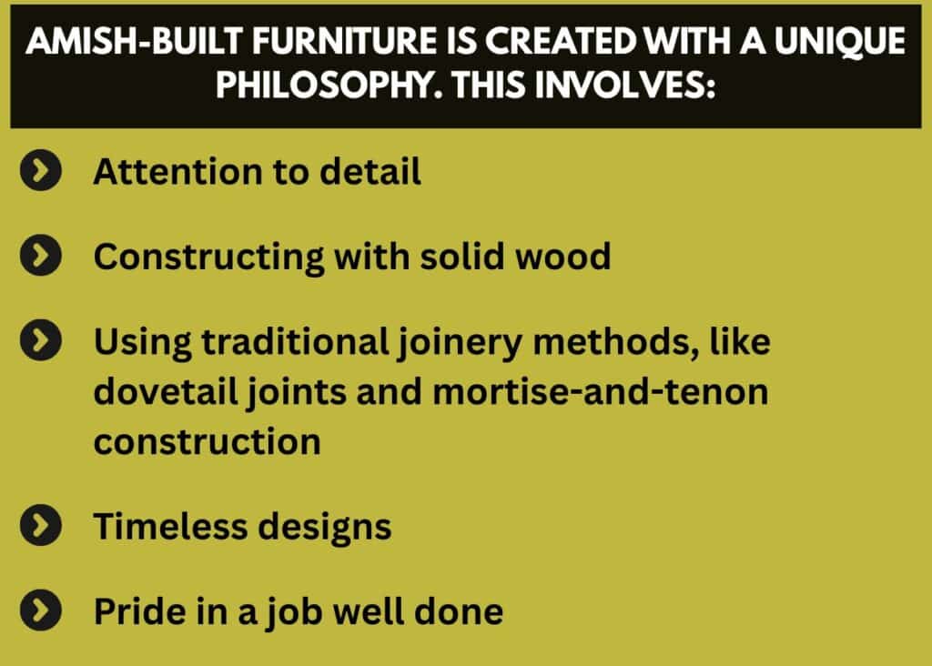 Amish-built furniture is created with an entirely different philosophy. Instead of speed and scale, their furniture is designed to hold up for generations, becoming an heirloom. This involves: